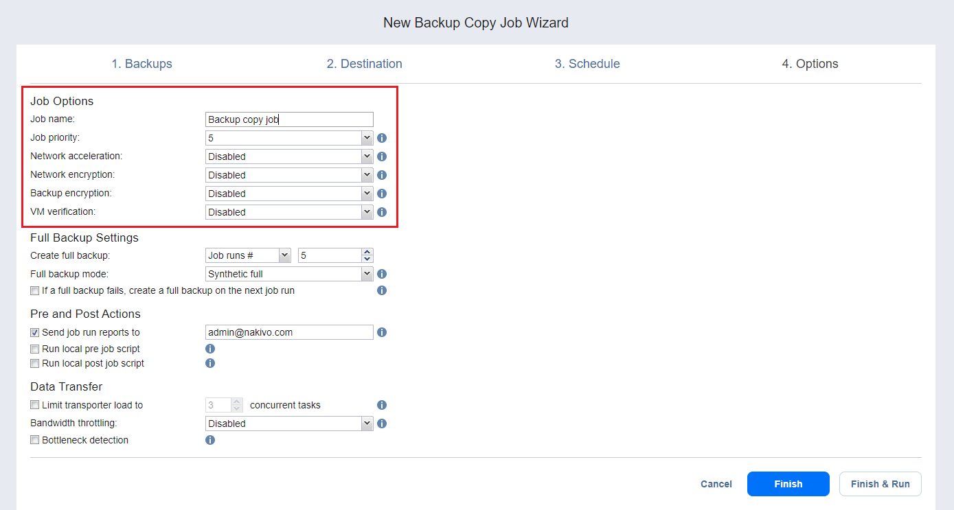 NAKIVO Backup & Replication permite configurar determinadas acciones antes de que comience un job de copia de backup y después de que haya finalizado. Puede elegir enviar los informes de ejecución del job al correo electrónico proporcionado y ejecutar script locales previo al job y posterior al job.