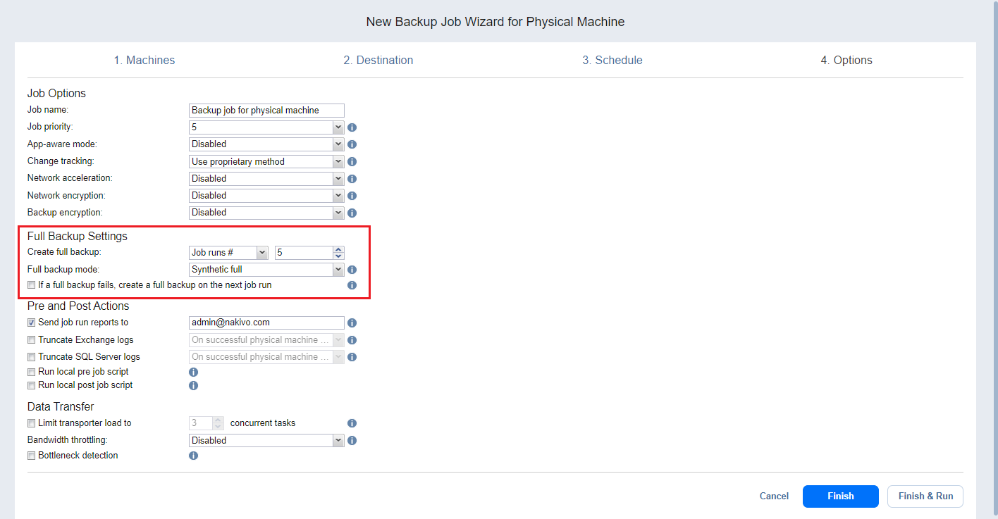 Asistente de job de backups para equipos físicos: Opciones