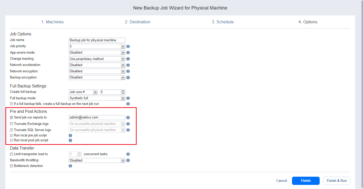 NAKIVO Backup & Replication le ofrece la posibilidad de activar determinadas acciones antes de que comience un job de backups y después de que haya finalizado. Puede elegir enviar los informes de ejecución del job, truncar los registros de Microsoft Exchange y SQL Server y ejecutar script locales previo al job y posterior al job.