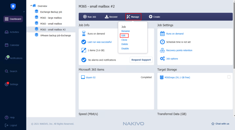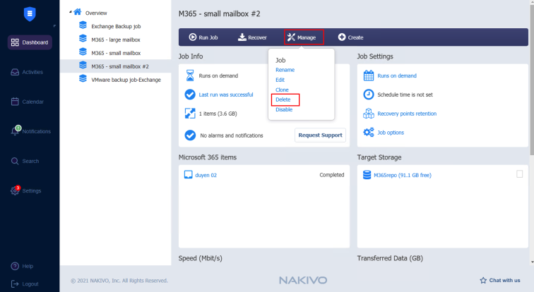 NAKIVO Backup & Replication le ofrece la posibilidad de desactivar jobs. Un job desactivado no se ejecuta según una programación, ni puede ejecutarse bajo demanda.