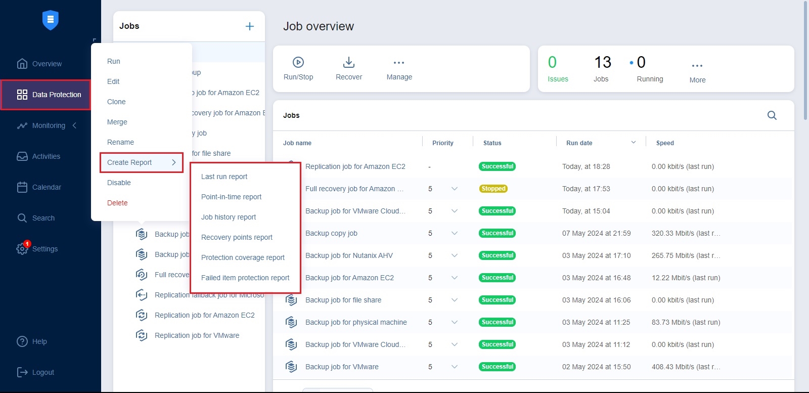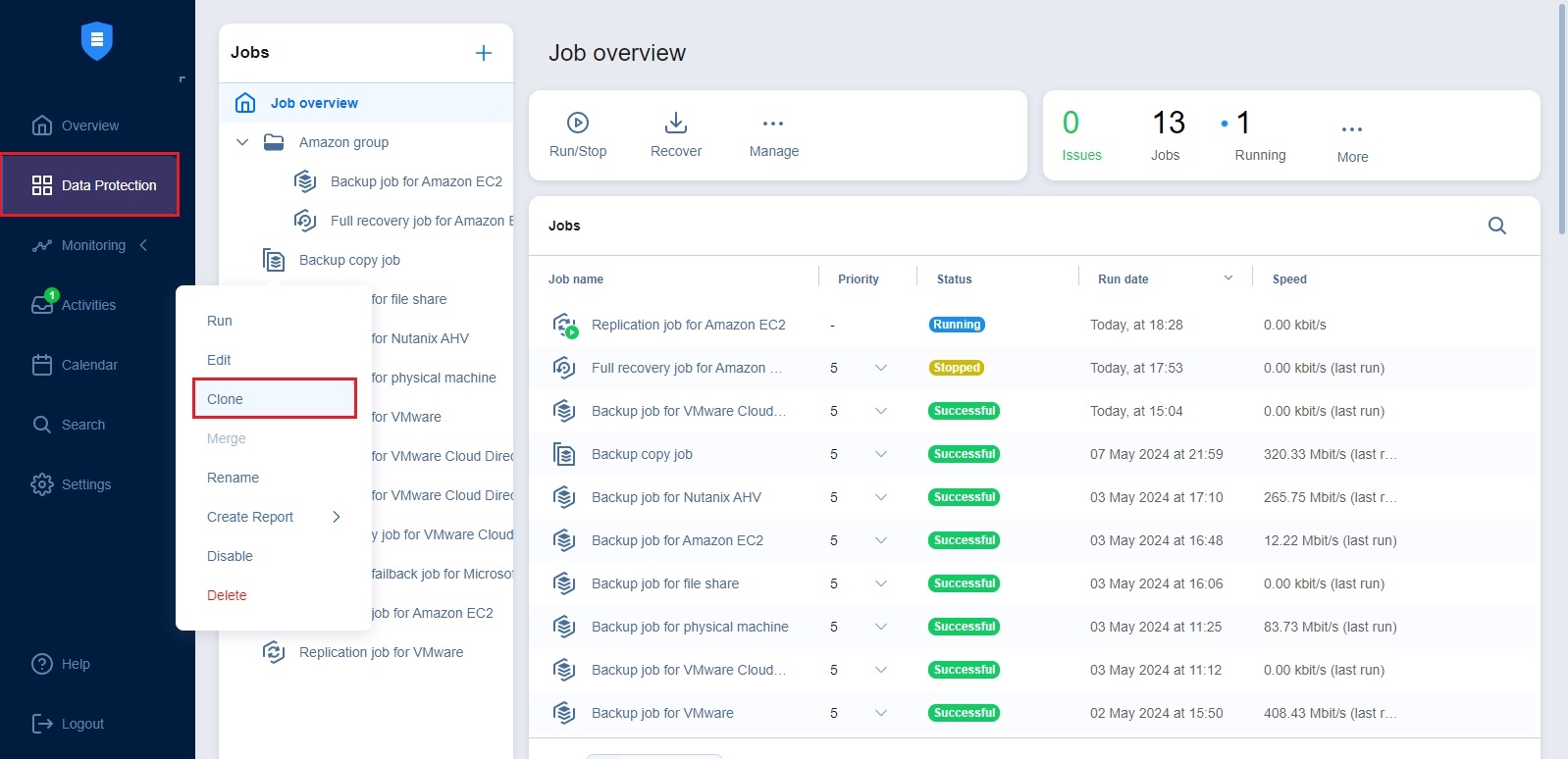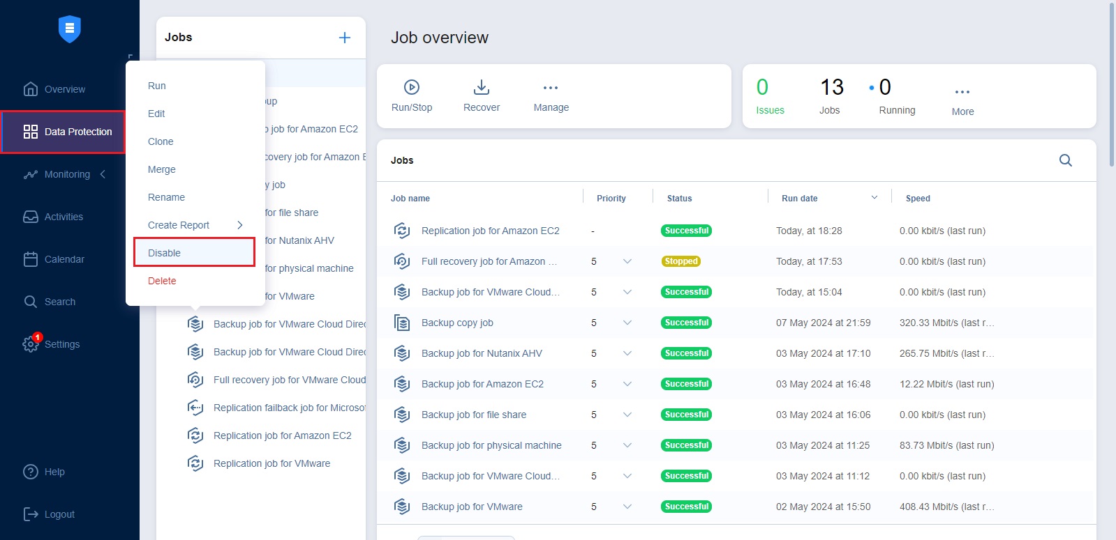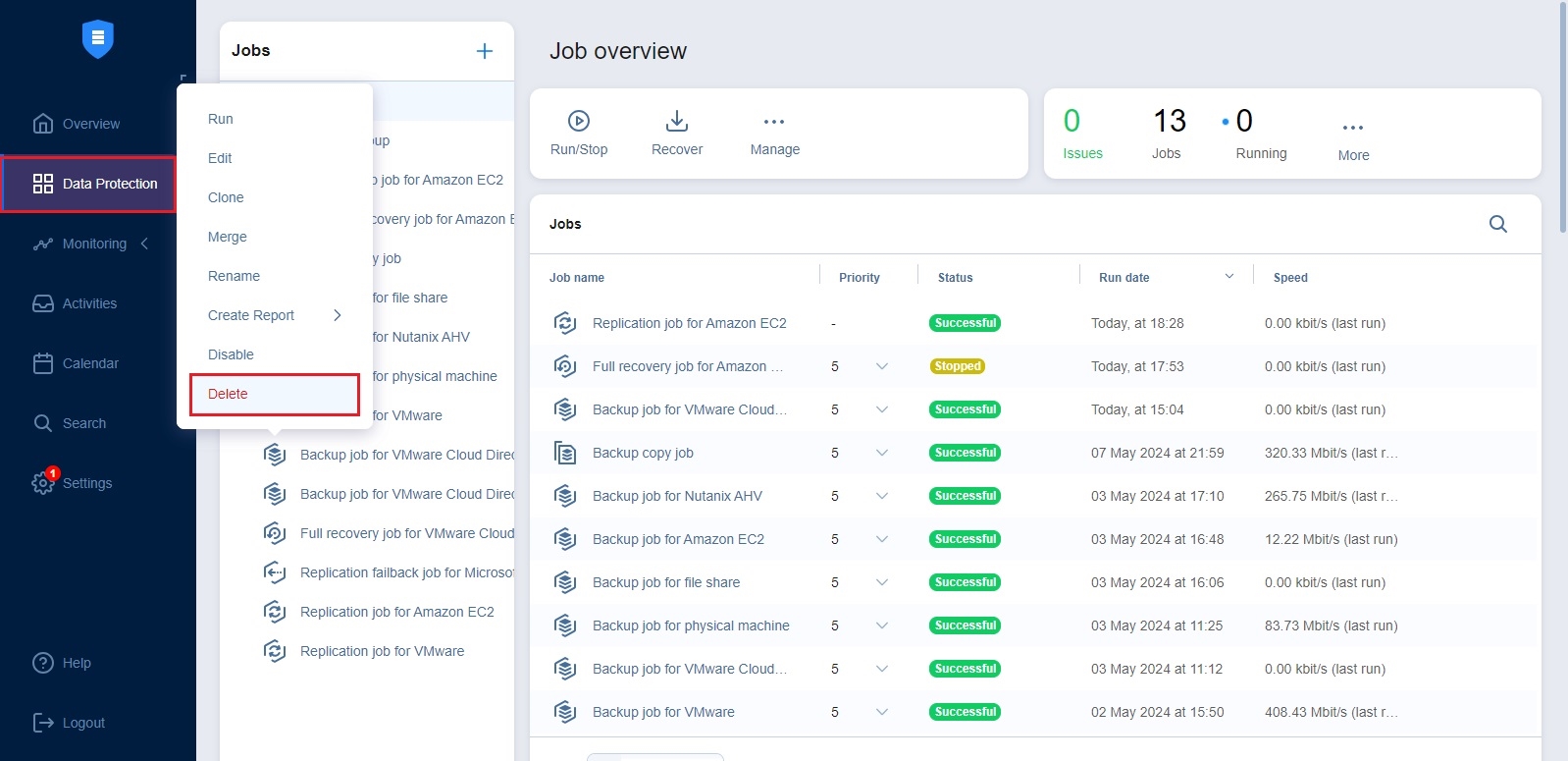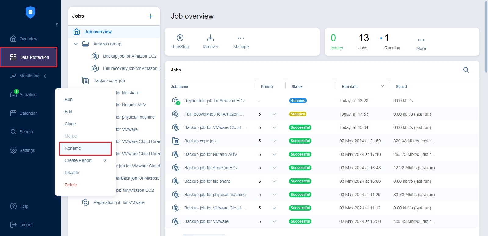 Gestiona fácilmente los jobs desde el menú Protección de datos. Utilice el menú Gestionar para renombrar, editar, fusionar, eliminar y activar/desactivar jobs.
