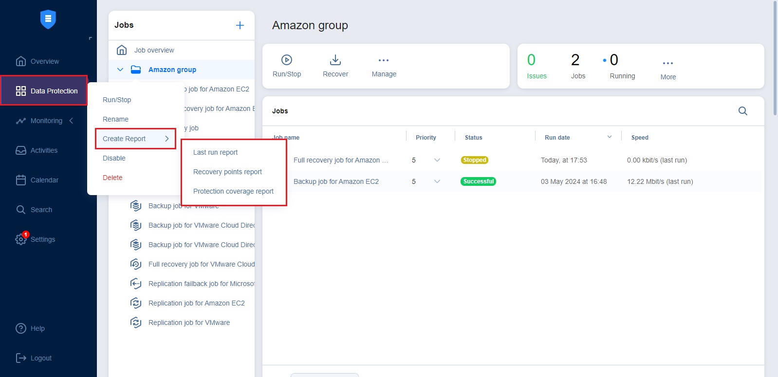 Puede ver los detalles de ejecución del job en el panel de Protección de datos o Actividades.