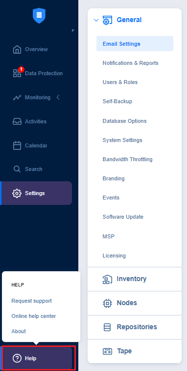 El menú principal de NAKIVO Backup & Replication se encuentra en la parte izquierda de la interfaz del producto. Proporciona acceso al panel general, los jobs, las actividades, el calendario, la búsqueda global y los ajustes del producto. También contiene el menú de ayuda y el botón Cerrar sesión.