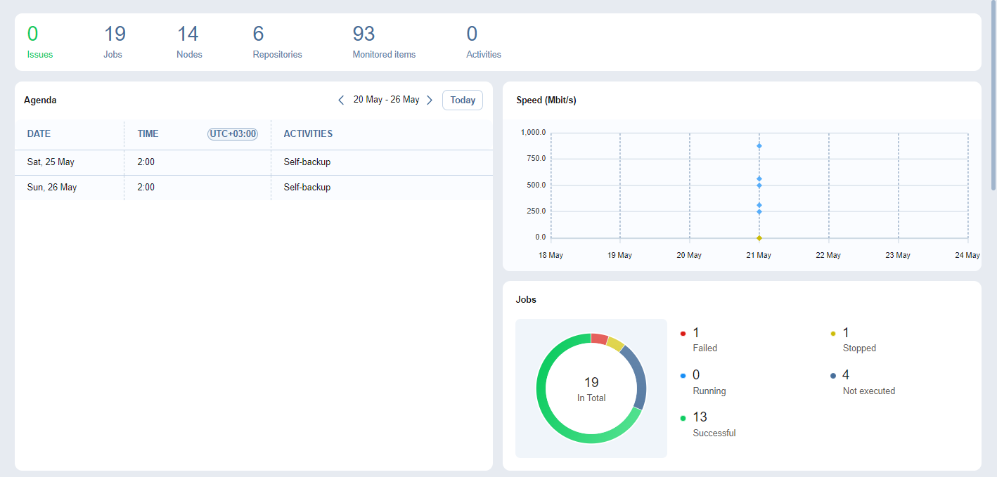 La página Overview muestra las estadísticas clave de su instancia de NAKIVO Backup & Replication. La información se muestra en los siguientes widgets:
