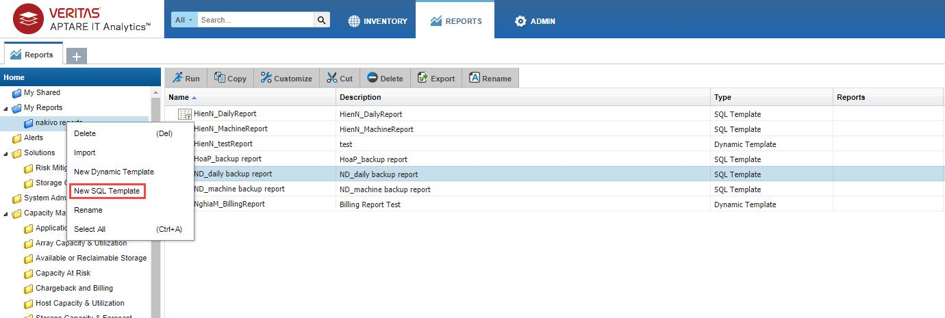 Vaya a la pestaña INFORMES del portal APTARE y realice las siguientes acciones: