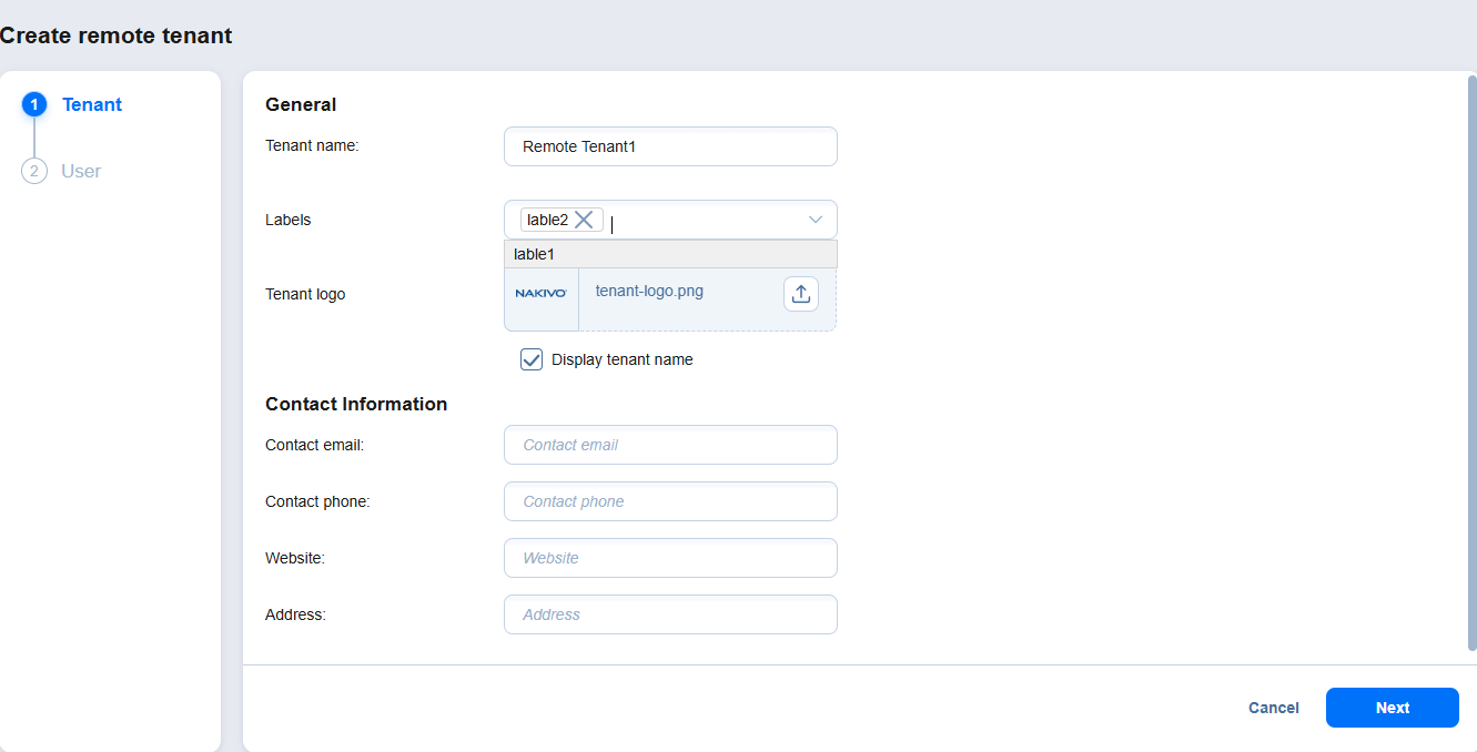 Opcionalmente, añada información de contacto del inquilino remoto rellenando los siguientes campos: