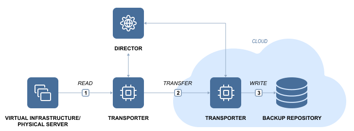 Un backup representa una copia puntual de una máquina virtual o física que se almacena en el Repositorio de backups. Un Repositorio de backups es el destino para almacenar los datos de backups. NAKIVO Backup & Replication le permite crear repositorios de backups en nubes públicas como Amazon EC2, Amazon S3, almacenamiento genérico compatible con S3, Microsoft Azure, Backblaze B2 o Wasabi. En NAKIVO Backup & Replication, un job de backup se hace de la siguiente manera: