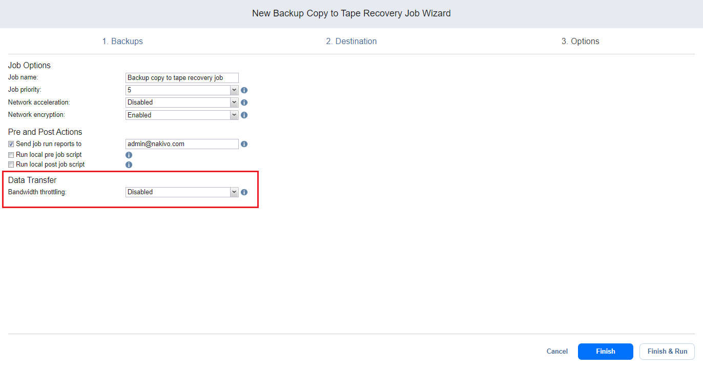 En esta sección, elija un modo de transporte para escribir datos, seleccione qué Transportador utilizar para leer datos del backups de origen y configure la limitación del ancho de banda.