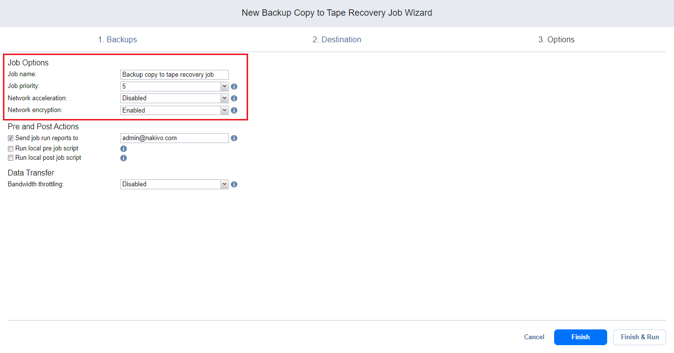 Asistente para hacer backups a trabajos de recuperación de cintas: Opciones