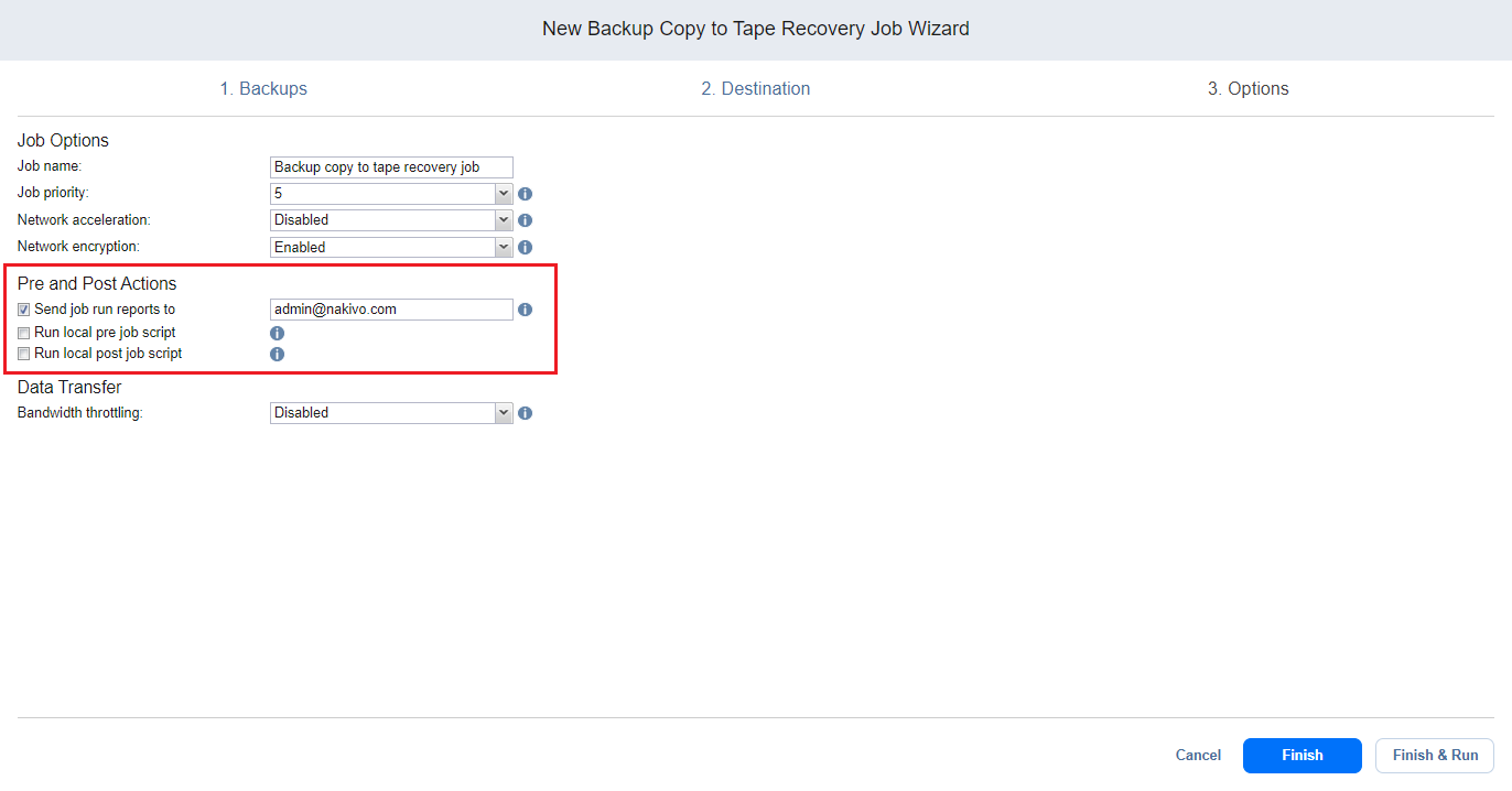 NAKIVO Backup & Replication permite ejecutar un script antes de que comience la recuperación (un script previo al job) y después de que se haya completado la recuperación de todas las copias de backup del job (un script posterior al job). Los scripts sólo pueden ejecutarse en la máquina en la que está instalado el Director.