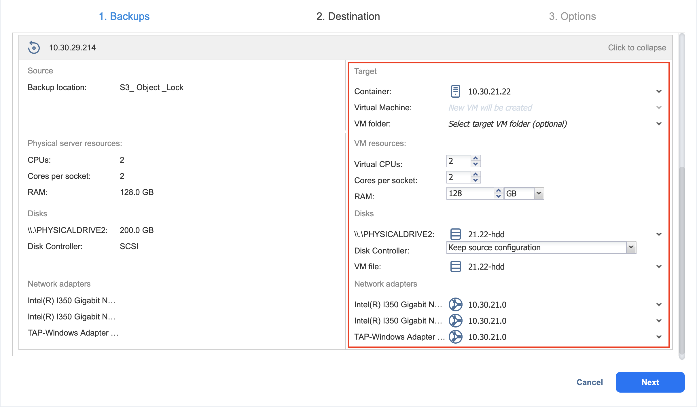 VMware le permite asignar no más de 10 adaptadores de red (NICs) por una máquina virtual. Por lo tanto, si la máquina de origen tiene más de 10 NICs, necesita omitir manualmente algunas NICs para asegurarse de que la máquina no tiene más de 10 NICs.