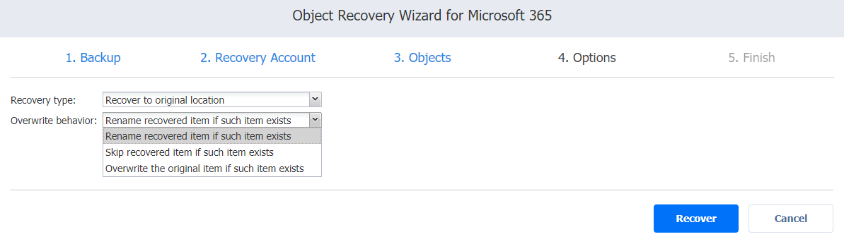 Asistente de recuperación de objetos de Microsoft 365: Opciones