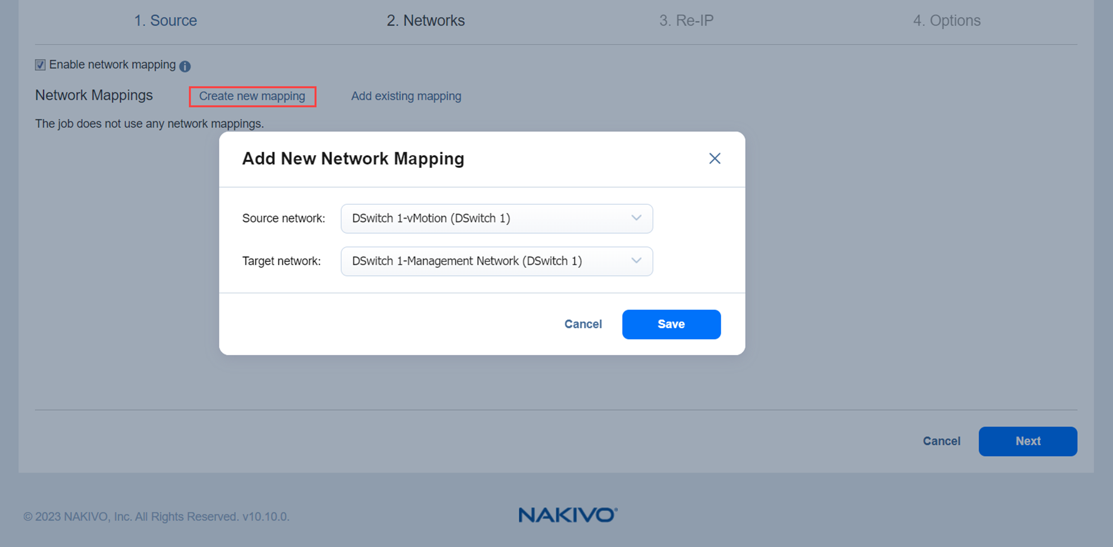 Cuando la red de réplicas en tiempo real - o red virtual VMware de destino - difiere de la dirección de red donde están instaladas las máquinas virtuales de origen - o red virtual VMware de origen - su job de failover necesita una relación entre estas redes para realizarse con éxito. Esta relación se denomina mapeo de la red.