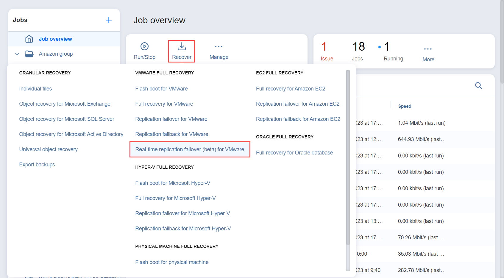 Para iniciar el proceso de conmutación por error de replicación en tiempo real, seleccione el job de replicación de VMware en tiempo real correspondiente y haga clic en Recuperar > Replicación en tiempo real (beta) de VMware. Tenga en cuenta que el job de replicación de VMware en tiempo real debe estar ejecutándose correctamente (o estaba ejecutándose correctamente antes y ahora está detenido) para que esta opción esté disponible.