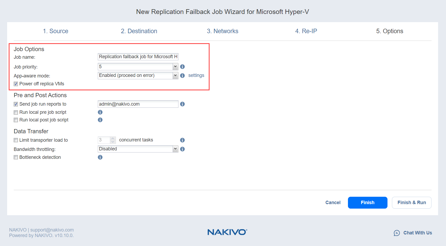 En la página Opciones del asistente, especifique las opciones para el job de conmutación por error de Microsoft Hyper-V como se describe en las siguientes secciones:
