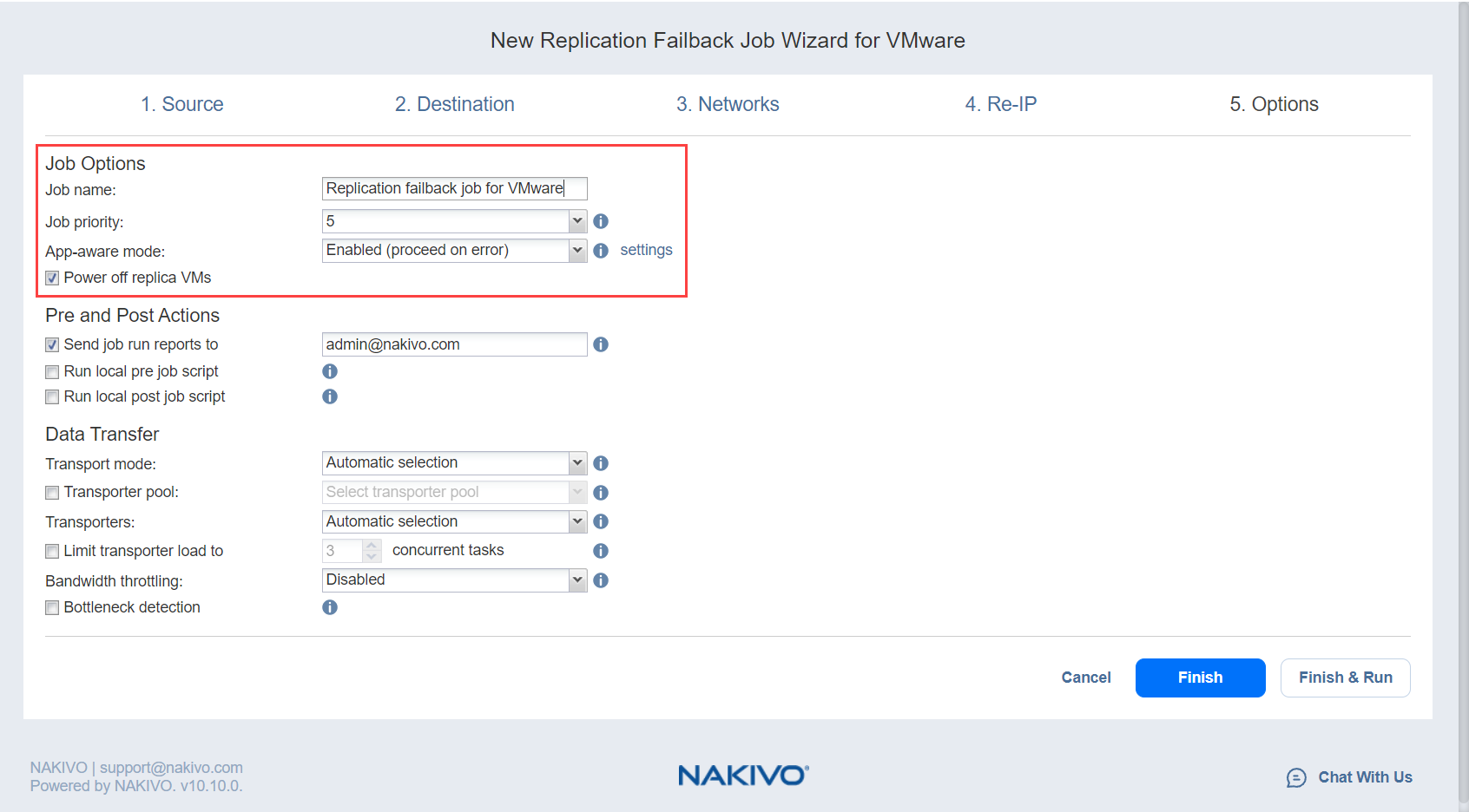 Asistente de Job de conmutación por error para VMware: Opciones