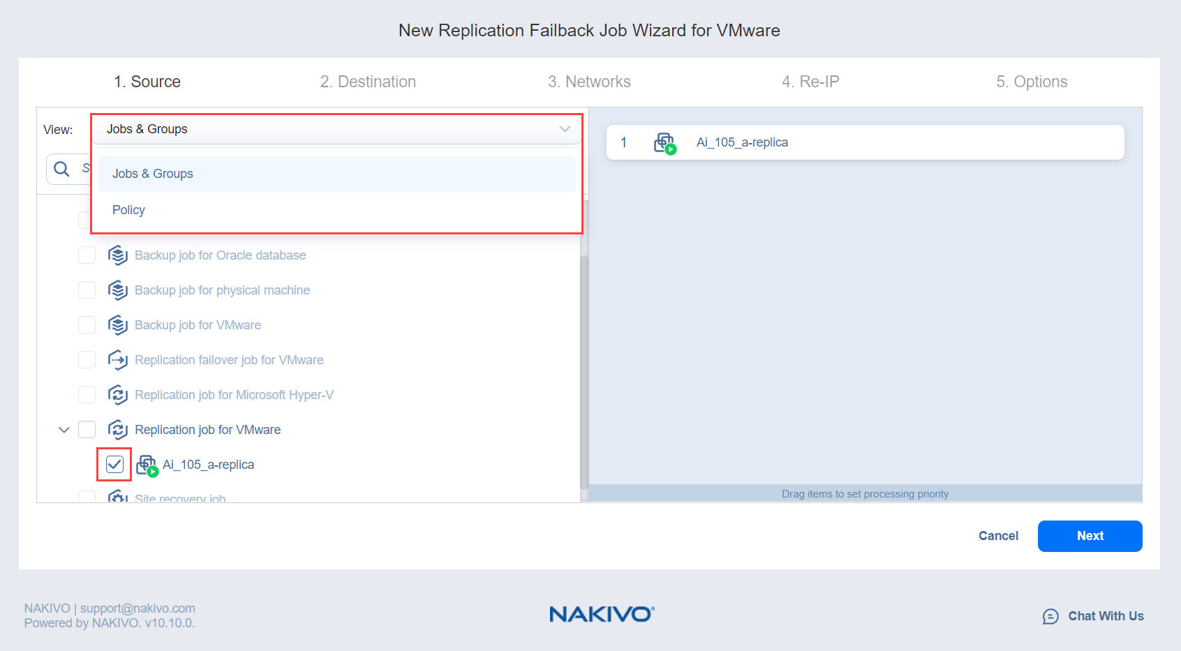 Asistente de conmutación por error Job para VMware: Origen