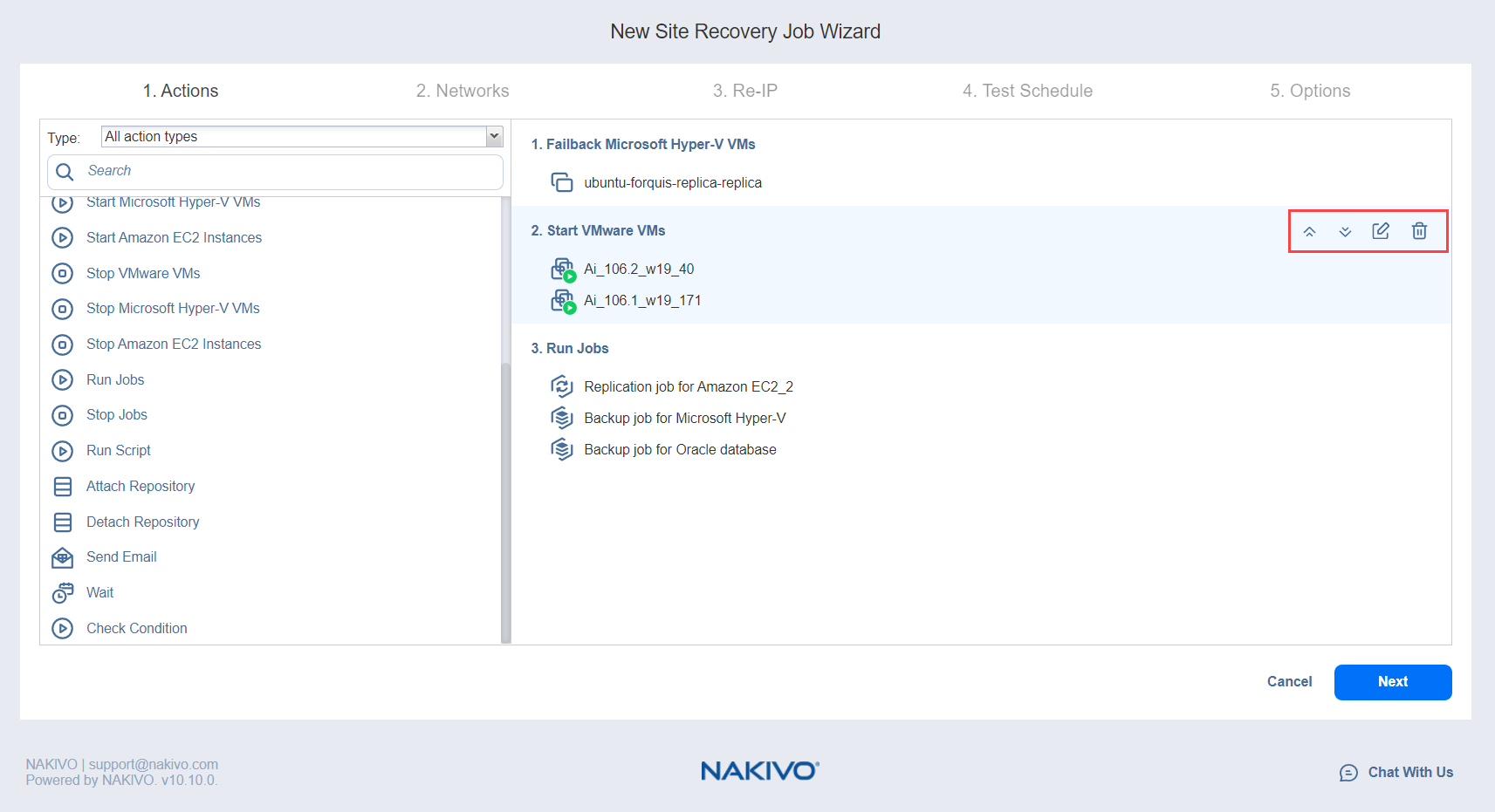 Para añadir una acción a un job de restauración del entorno, haga clic en el elemento correspondiente de la lista de acciones y siga las instrucciones del asistente que se abre.
