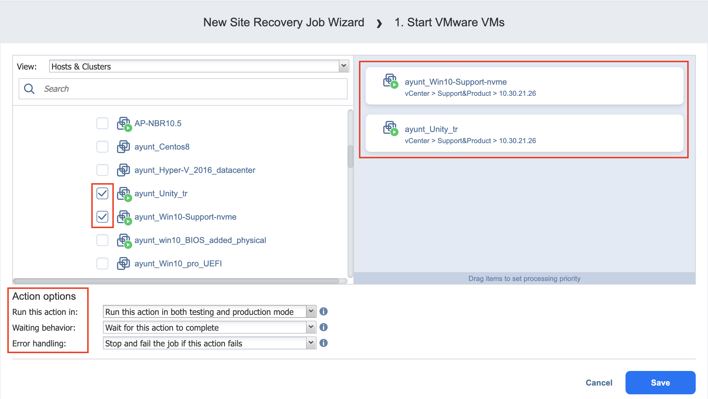 Configura las opciones de la acción. Consulte Asistente de job de restauración del entorno: Acciones para obtener más detalles.