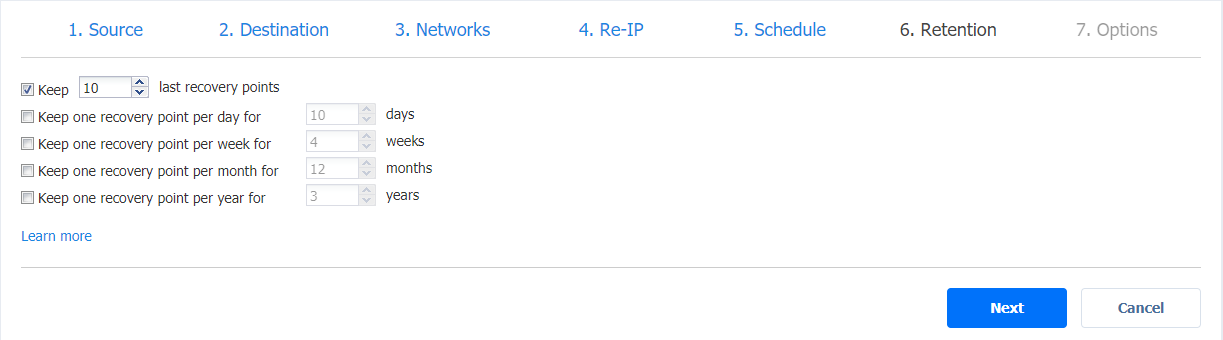 NAKIVO Backup & Replication puede crear un punto de recuperación (snapshot) en la réplica VM después de ejecutar cada job. Puede especificar el número de puntos de recuperación que se conservarán utilizando el esquema de rotación de backups Abuelo-Padre-Hijo (GFS).