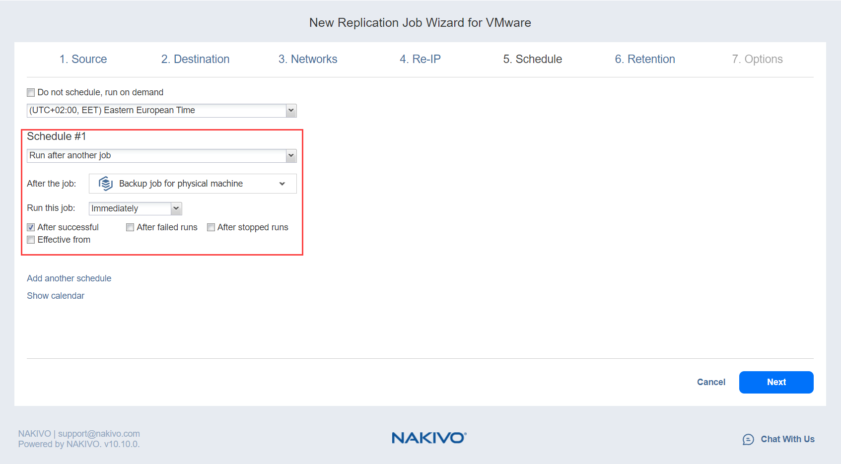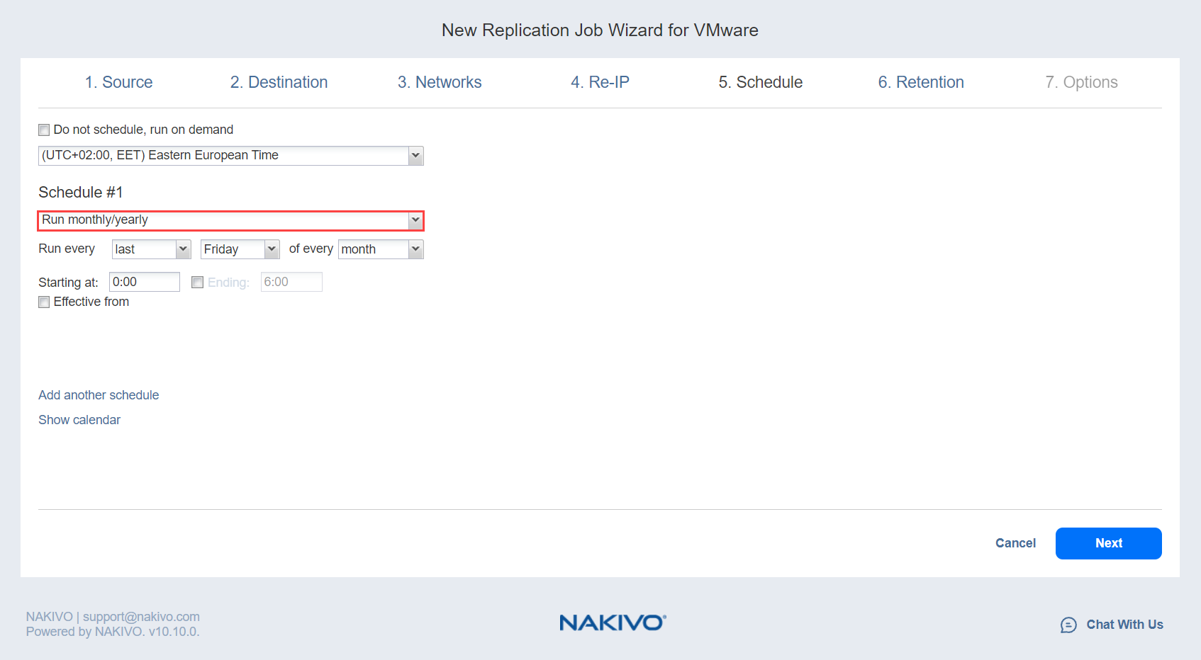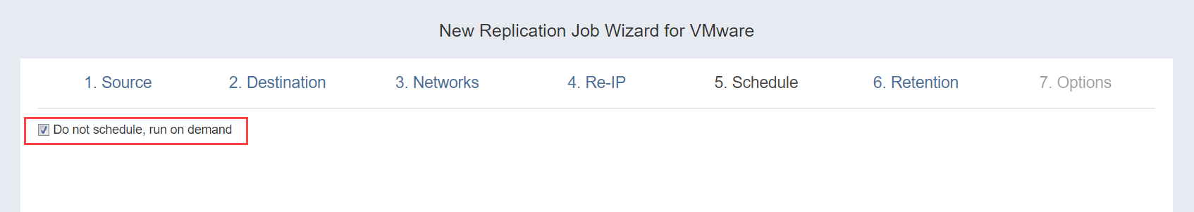 En la página Programación del asistente, seleccione si desea ejecutar el job de replicación manualmente o programarlo para que se ejecute de forma periódica.