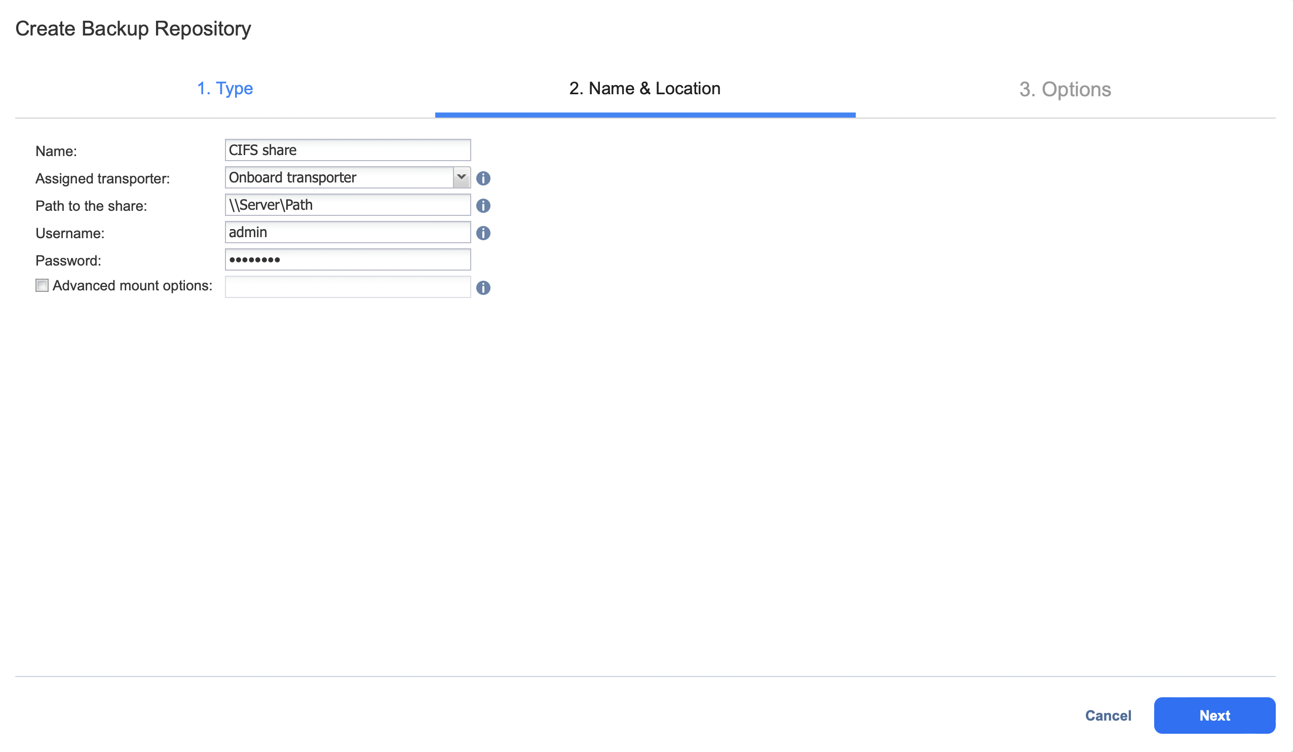Para crear un Repositorio de backups en un recurso compartido CIFS de Windows, proceda como se describe en las siguientes secciones: