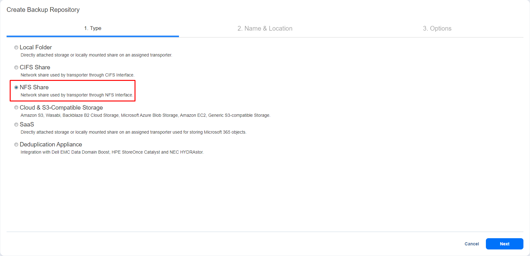 En la página Tipo del asistente Crear repositorios de backups, seleccione NFS compartido y haga clic en Siguiente para pasar a la página siguiente del asistente.