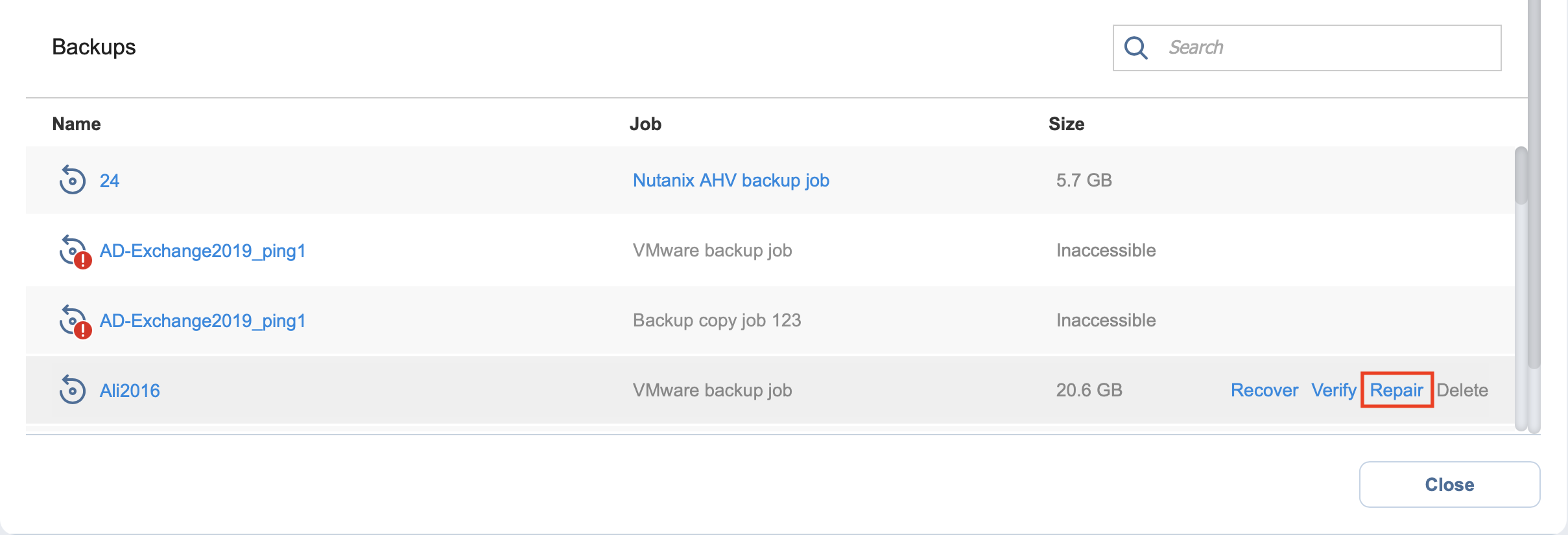 También puede realizar el proceso de Reparación de un objeto de backup cuando todos los archivos, excepto los inmutables, fueron eliminados manualmente del Repositorio de backups. La opción Reparar sólo está disponible en los siguientes casos: