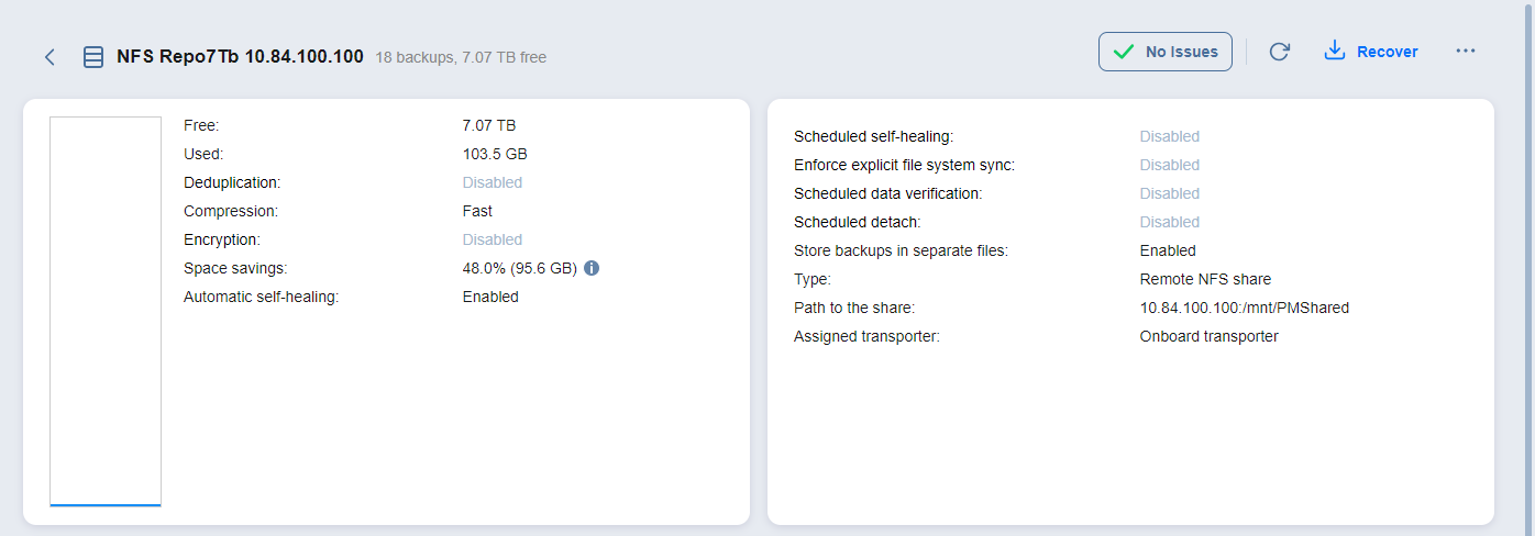 • Autorreparación automática: El estado de la opción de autorreparación automática para el Repositorio de backups.