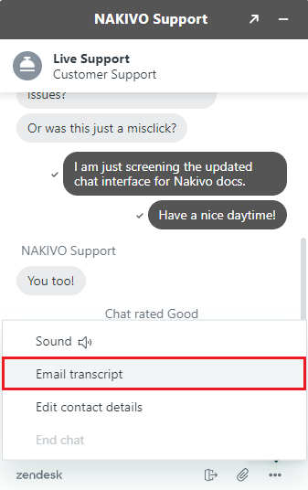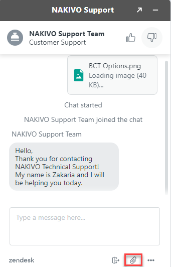 5. Su mensaje se envía a un representante de NAKIVO y se abre el cuadro de diálogo del chat integrado de asistencia en vivo.