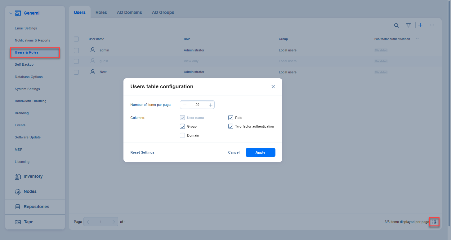 Puede mostrar/ocultar columnas o modificar el número de elementos por página en la tabla Usuarios. En la esquina inferior derecha, haga clic en el icono de controles. En la ventana de diálogo que se abre, marque/desmarque las casillas de verificación y haga clic en Aplicar. Existen las siguientes opciones: