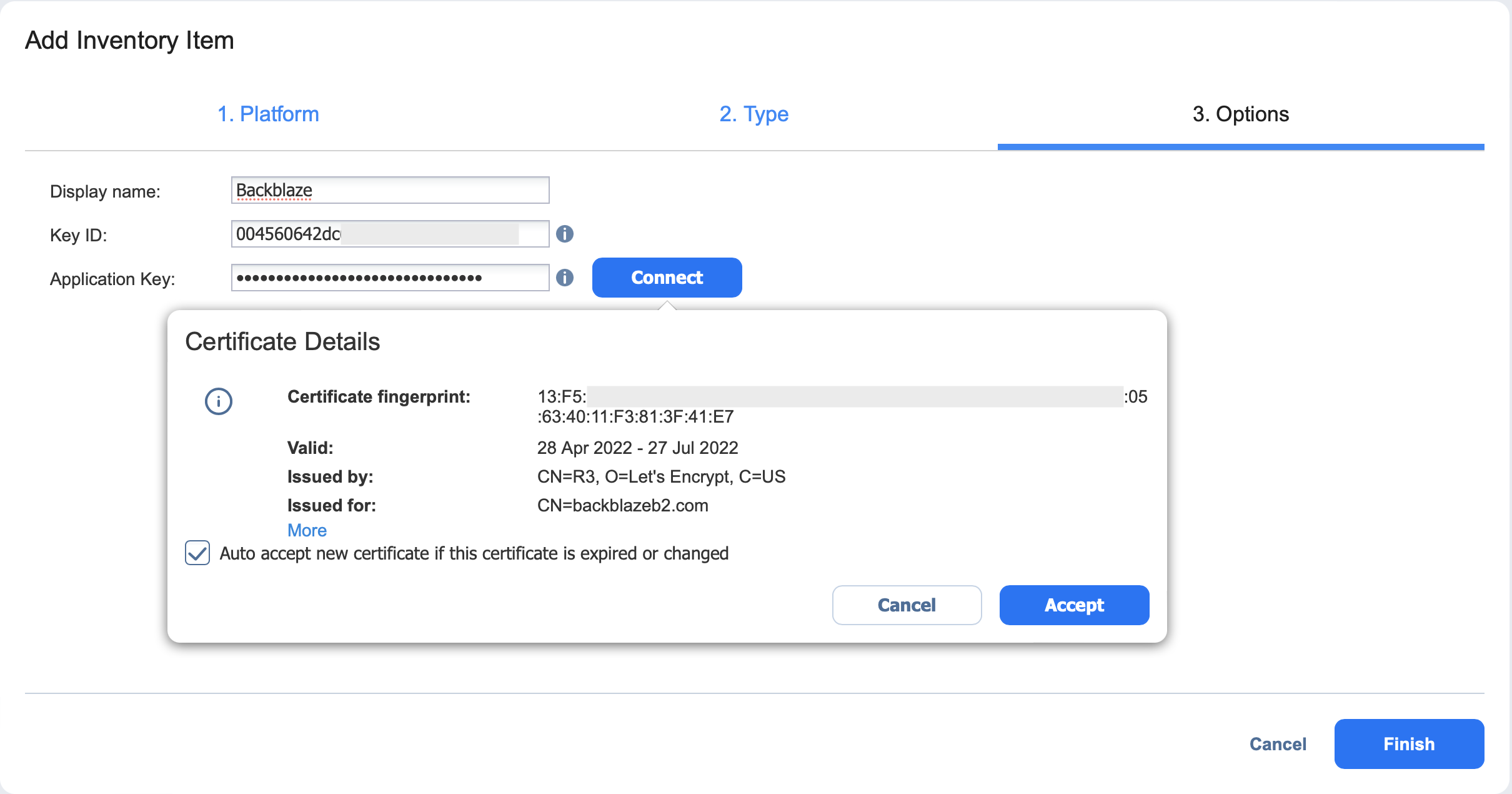 Para añadir una cuenta de almacenamiento Backblaze al inventario, haga lo siguiente: