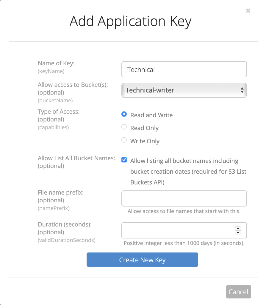 • Clave de aplicación: Introduzca la clave de aplicación generada en la página App Keys de su cuenta Backblaze.