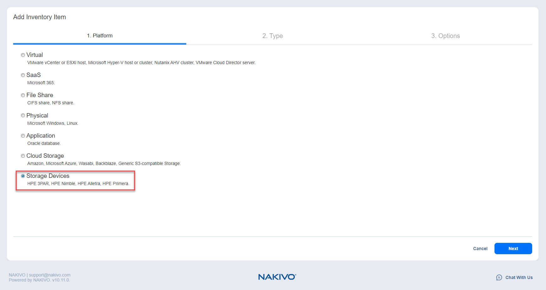 Para añadir un dispositivo de almacenamiento HPE 3PAR al inventario en NAKIVO Backup & Replication, siga los pasos que se indican a continuación: