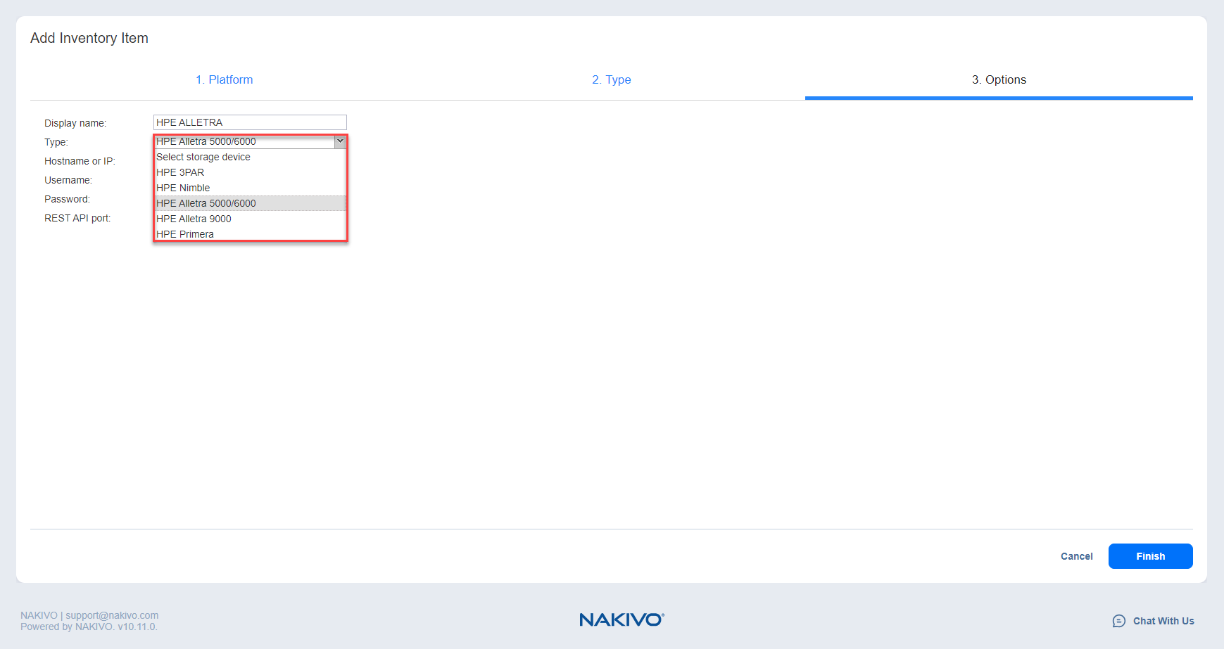 Para añadir un dispositivo de almacenamiento HPE Alletra al inventario de NAKIVO Backup & Replication, siga los pasos que se indican a continuación: