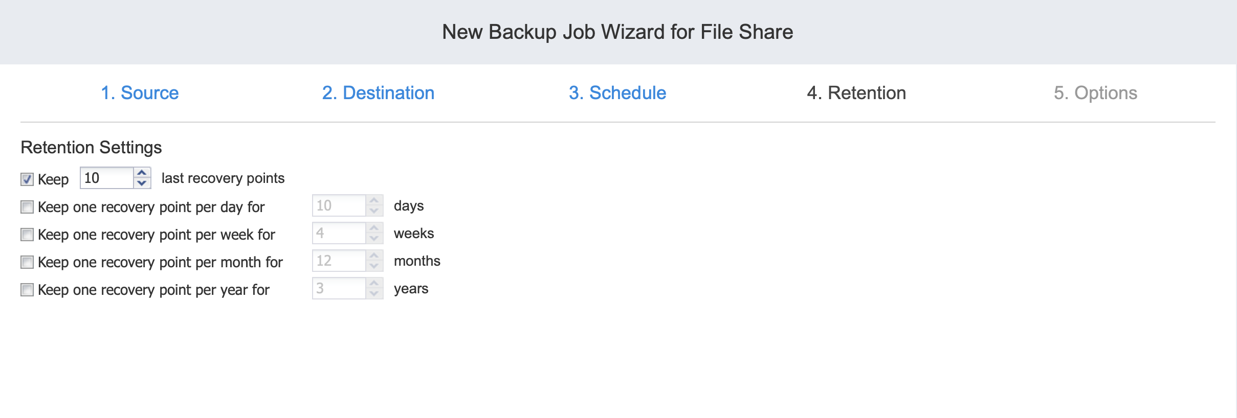 - Conservar x últimos puntos de recuperación: Conserva el número especificado de últimos puntos de recuperación para cada recurso compartido de archivos del job.