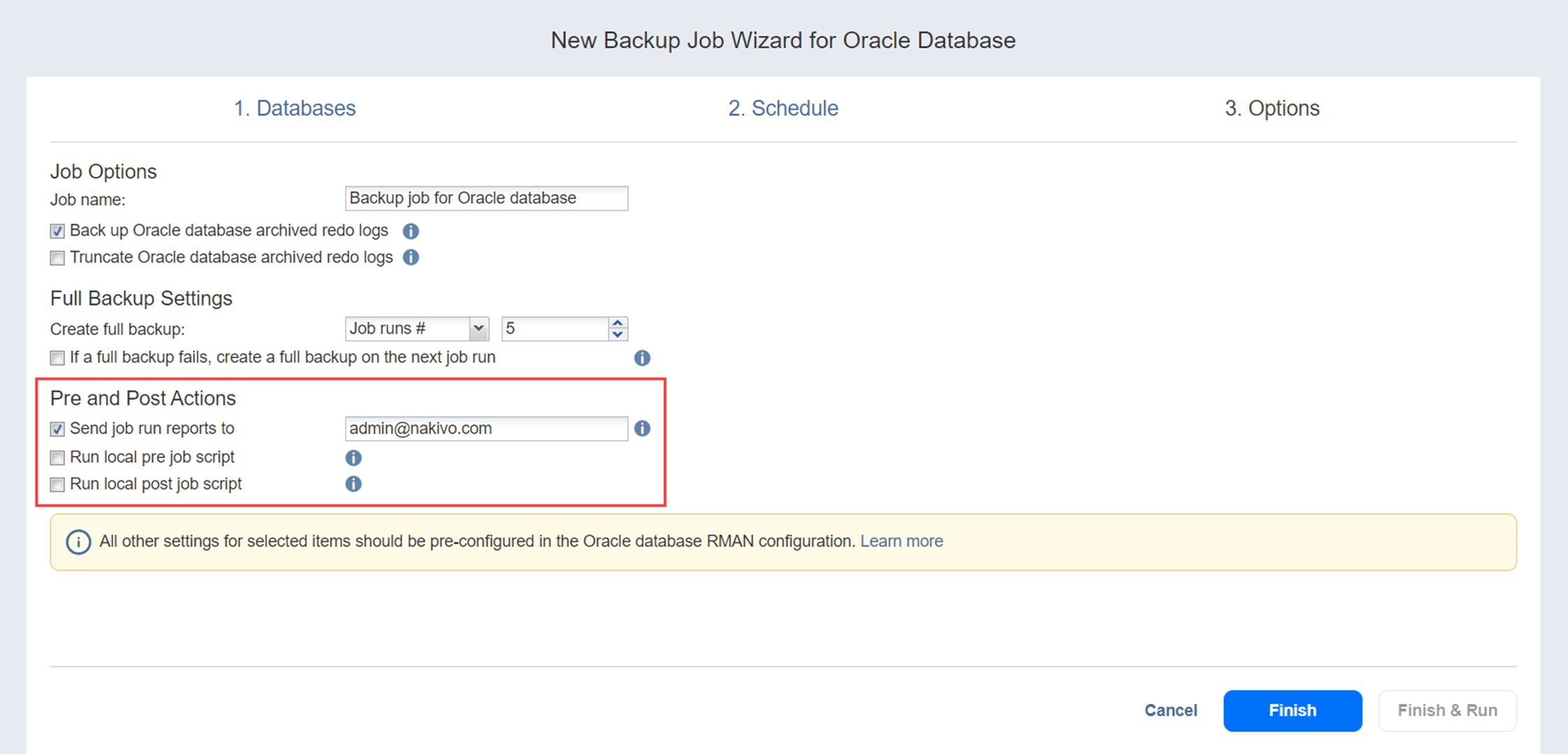 En la página Opciones del asistente, puede asignar un nombre al trabajo, elegir hacer una copia de seguridad y truncar los redo logs archivados de la base de datos Oracle, configurar copias de seguridad completas, así como acciones previas y posteriores al trabajo.