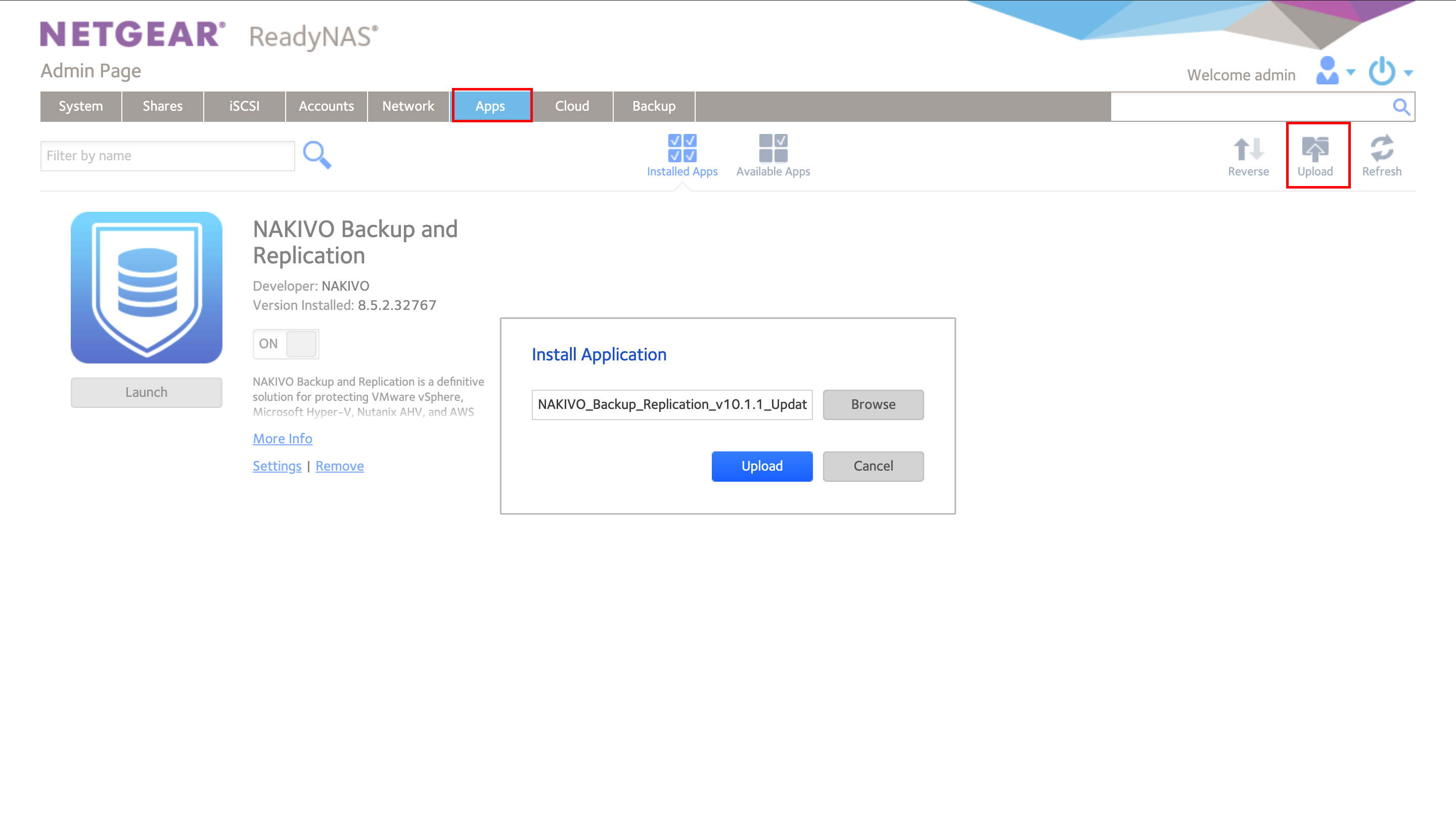 Siga los pasos que se indican a continuación para actualizar NAKIVO Backup & Replication en NETGEAR ReadyNAS a través de las aplicaciones disponibles:
