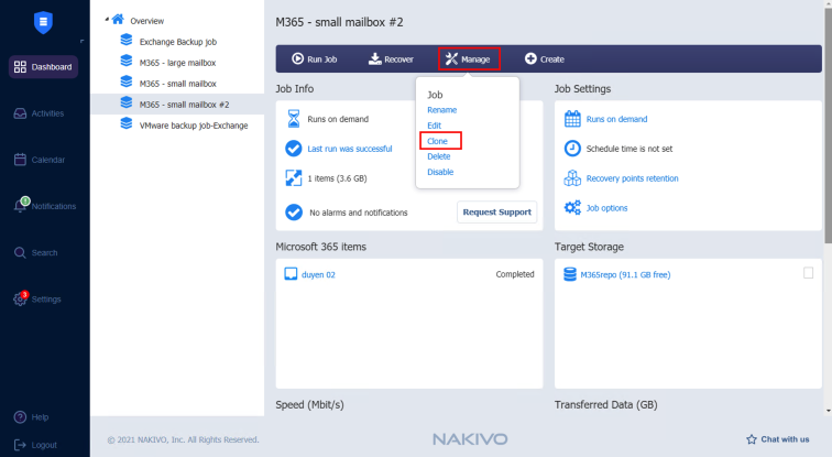 Si el job original utiliza un backup o réplica existente como destino, el backup o réplica se restablecerá en el job clonado.