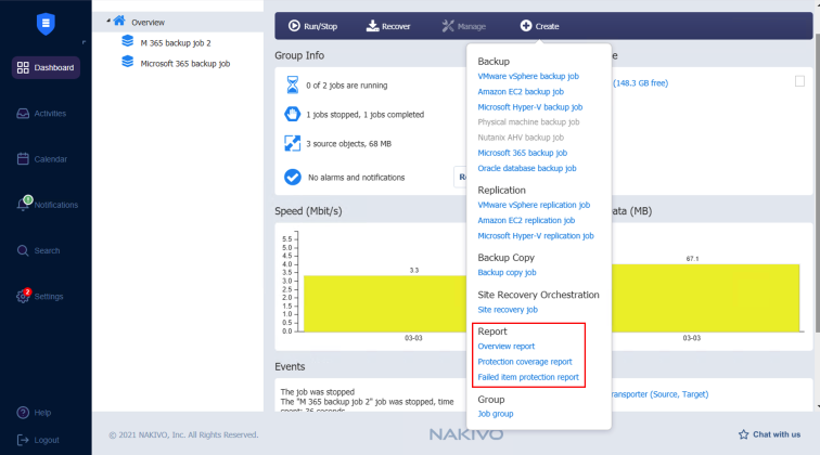 Informe de cobertura de protección: Contiene información sobre todas las máquinas virtuales e instancias protegidas por jobs de backups y/o replicación, así como sobre todas las máquinas virtuales e instancias no protegidas. Elija los formatos PDF o CSV para su Informe de cobertura de protección y haga clic en Crear.