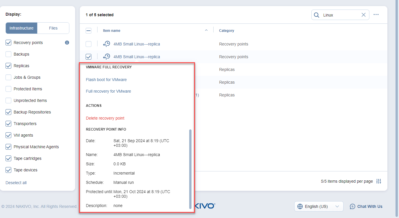 Con la búsqueda global de NAKIVO Backup & Replication, puede aplicar una acción masiva a los objetosque pertenezcan a la misma categoría y sean del mismo tipo.