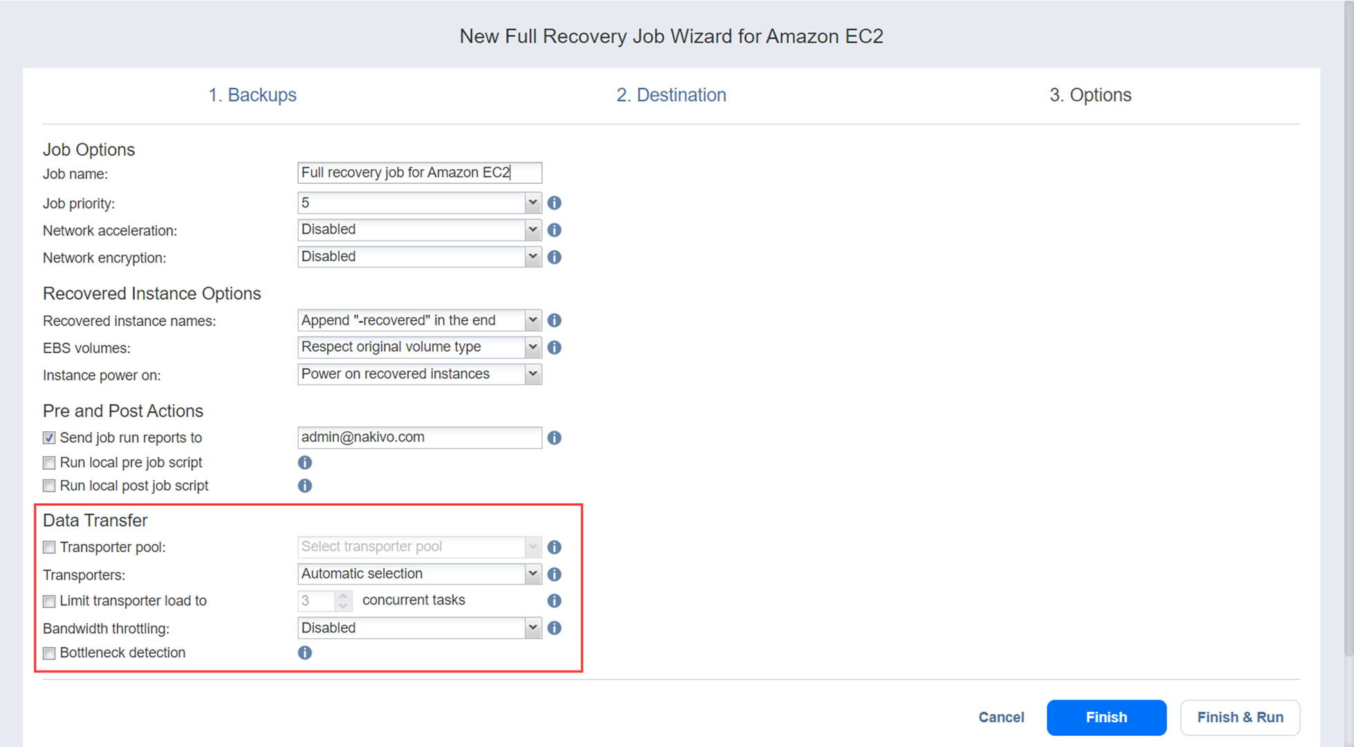 Asistente para jobs de recuperación para Amazon EC2: Opciones