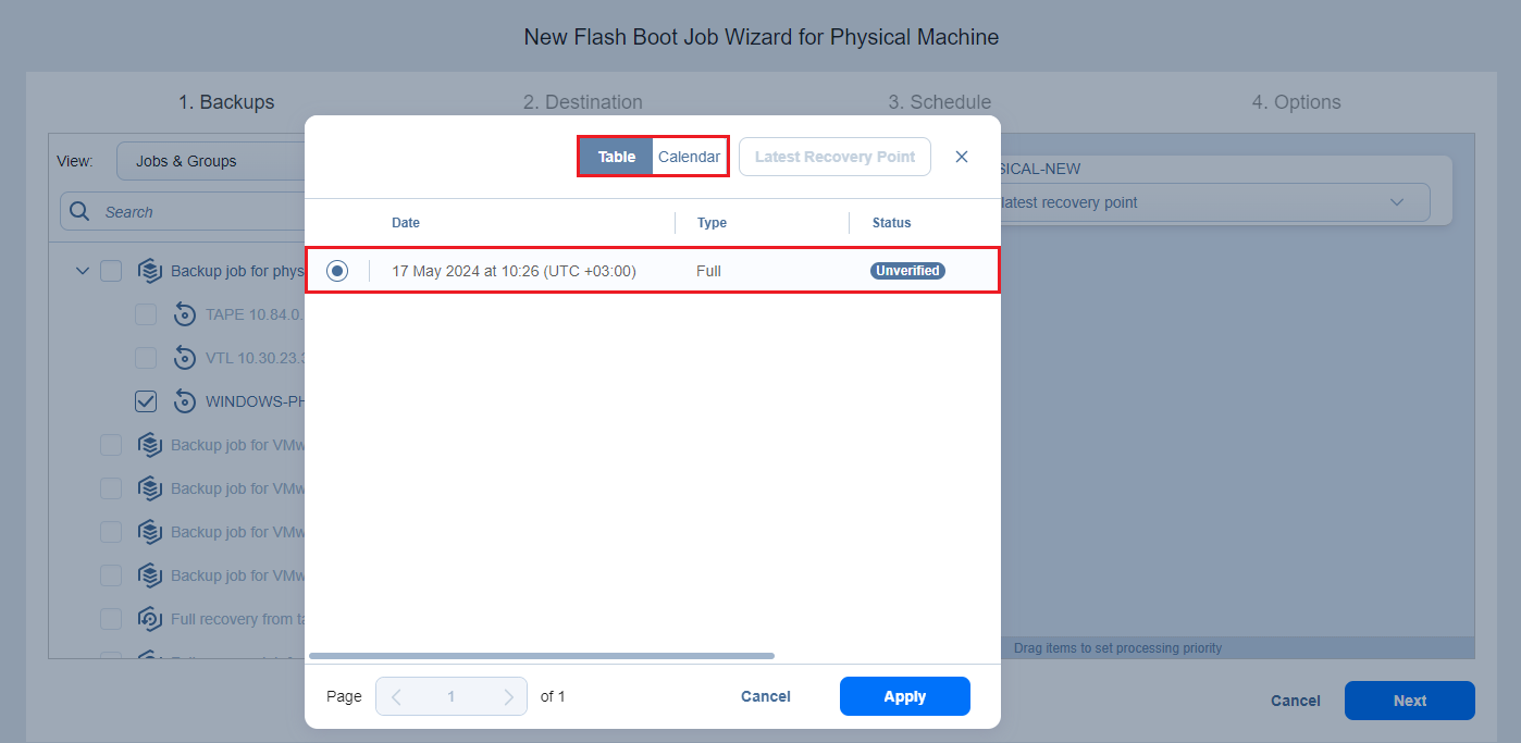 1. En la página Backups del asistente, selecciona uno o más backups de máquinas físicas utilizando la vista Repositorios de backups o Jobs & Groups en el panel izquierdo.