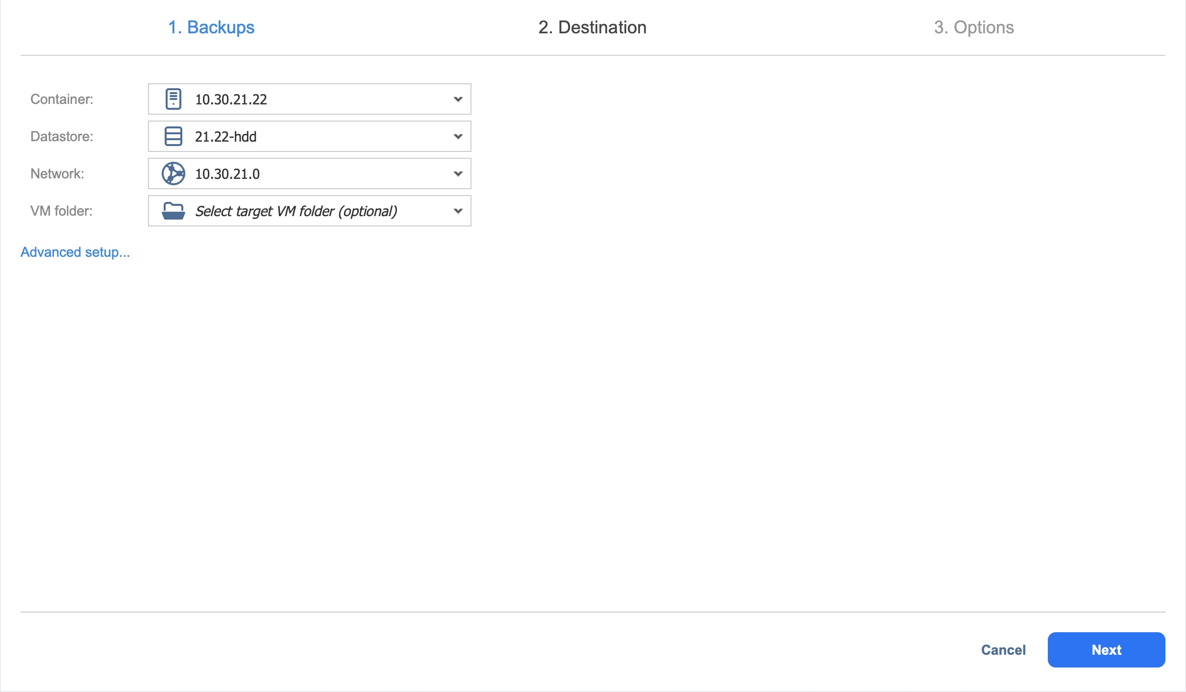 4. Elija una ubicación de destino seleccionando el contenedor, la máquina virtual y la carpeta necesarios.