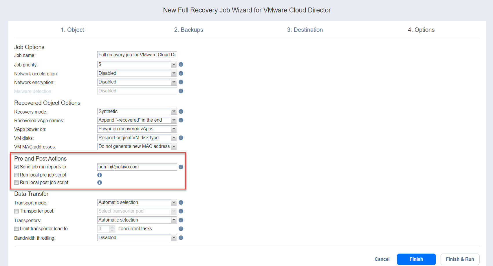 NAKIVO Backup & Replication permite ejecutar un script antes de que comience la recuperación (un script pre-job) y después de que haya finalizado la recuperación de todos los objetos del job (un script post-job). Los scripts sólo pueden ejecutarse en la máquina en la que está instalado el Director. Para obtener más información sobre los guiones previos y posteriores a los jobs, consulte Guiones previos y posteriores a los jobs.