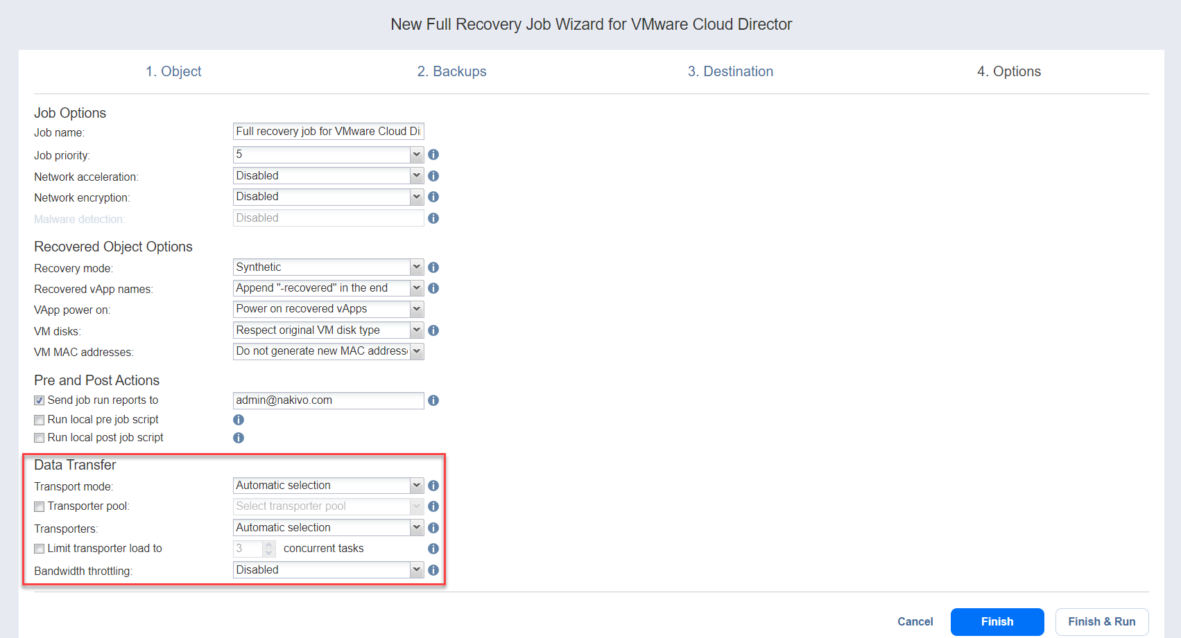 Asistente para jobs de recuperación para VMware Cloud Director: Opciones