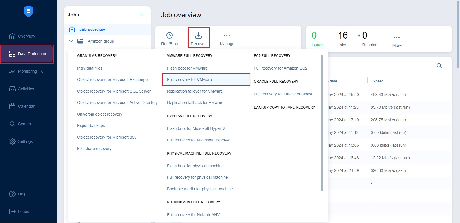 Inicie la recuperación desde el menú Protección de datos haciendo clic en Recuperar y, a continuación, en Recuperación completa para VMware.