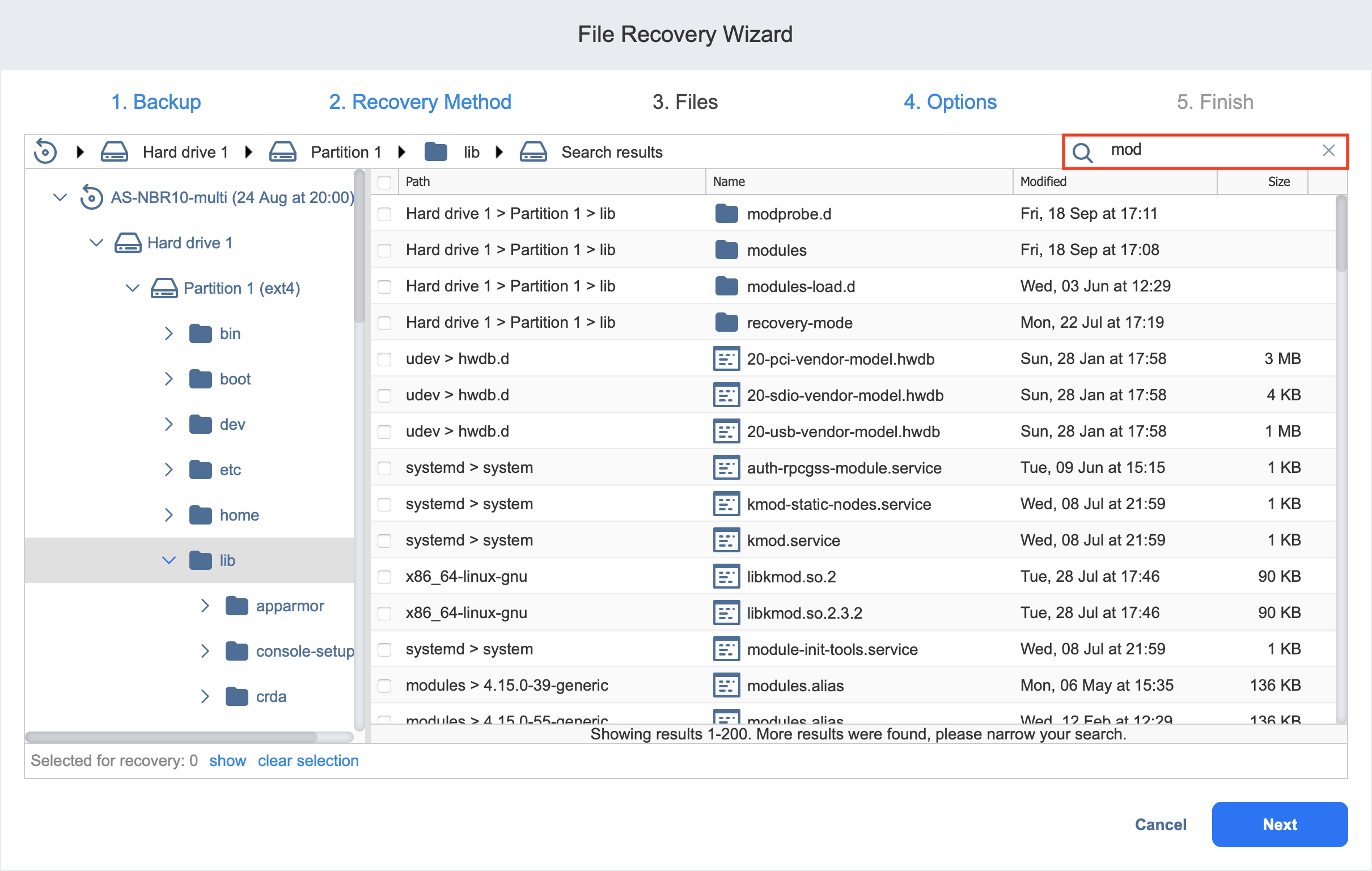 - Selección de archivos y carpetas para su recuperación
