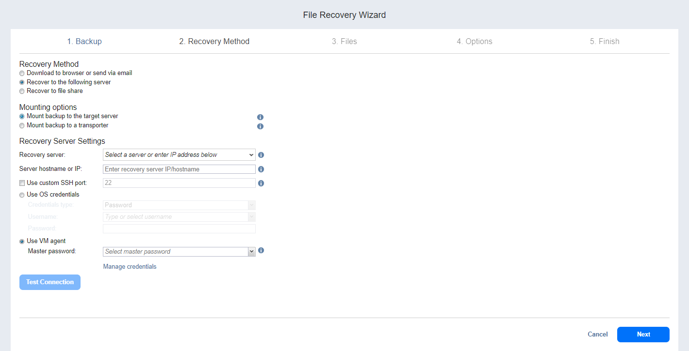 5. Seleccione la opción Usar agente de máquina virtual para recuperar los archivos a través del agente permanente. El producto rellena automáticamente la Contraseña maestra si se detecta el Agente permanente desde el servidor de recuperación seleccionado.