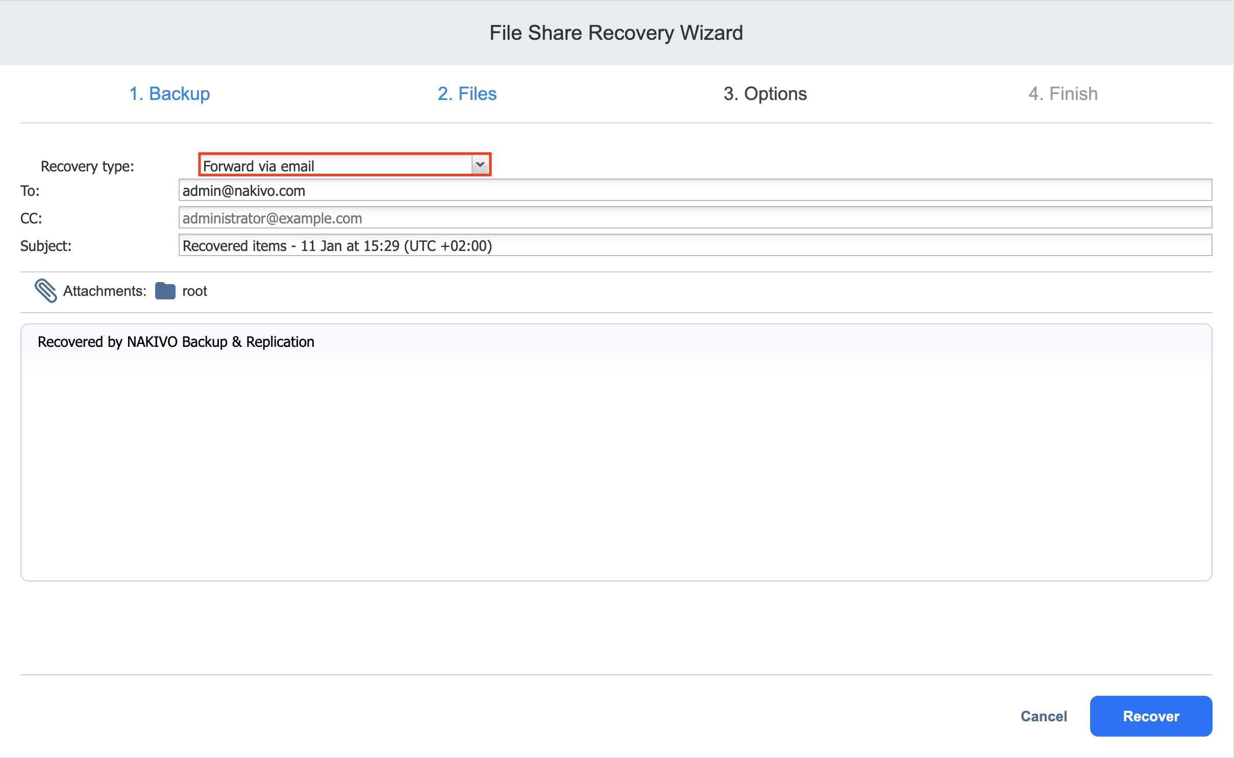 Para utilizar este tipo de recuperación, los ajustes de correo electrónico deben estar correctamente configurados en NAKIVO Backup & Replication Configuration. Consulte Ajustes de correo electrónico para obtener más detalles.